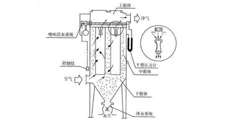 通過(guò)噴吹壓縮空氣的方法除掉過(guò)濾介質(zhì)(布袋或?yàn)V筒)上附著的粉塵;根據(jù)除塵器的大小可能有幾組脈沖閥,由脈沖控制儀或PLC控制,每次開(kāi)一組脈沖閥來(lái)除去它所控制的那部分布袋或?yàn)V筒的灰塵,而其他的布袋或?yàn)V筒正常工作,隔一段時(shí)間后下一組脈沖閥打開(kāi),清理下一部分除塵器由灰斗、上箱體、中箱體、下箱體等部分組成,上、中、下箱體為分室結(jié)構(gòu)。工作時(shí),含塵氣體由進(jìn)風(fēng)道進(jìn)入灰斗,粗塵粒直接落入灰斗底部,細(xì)塵粒隨氣流轉(zhuǎn)折向上進(jìn)入中、下箱體,粉塵積附在濾袋外表面,過(guò)濾后的氣體進(jìn)入上箱體至凈氣集合管-排風(fēng)道,經(jīng)排風(fēng)機(jī)排至大氣。 清灰過(guò)程是先切斷該室的凈氣出口風(fēng)道,使該室的布袋處于無(wú)氣流通過(guò)的狀態(tài)(分室停風(fēng)清灰)。