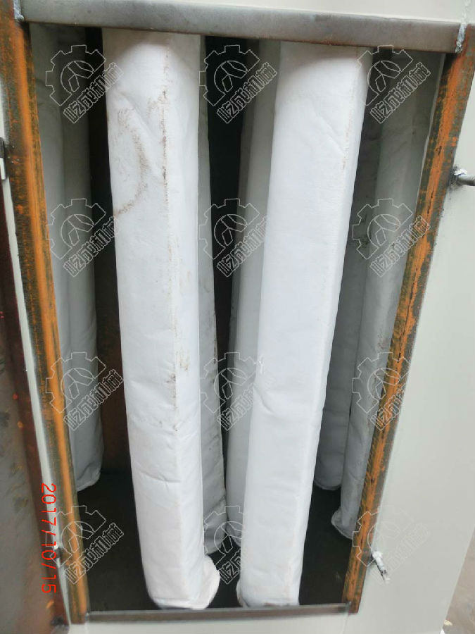 通過噴吹壓縮空氣的方法除掉過濾介質(zhì)(布袋或?yàn)V筒)上附著的粉塵;根據(jù)除塵器的大小可能有幾組脈沖閥,由脈沖控制儀或PLC控制,每次開一組脈沖閥來除去它所控制的那部分布袋或?yàn)V筒的灰塵,而其他的布袋或?yàn)V筒正常工作,隔一段時(shí)間后下一組脈沖閥打開,清理下一部分除塵器由灰斗、上箱體、中箱體、下箱體等部分組成,上、中、下箱體為分室結(jié)構(gòu)。工作時(shí),含塵氣體由進(jìn)風(fēng)道進(jìn)入灰斗,粗塵粒直接落入灰斗底部,細(xì)塵粒隨氣流轉(zhuǎn)折向上進(jìn)入中、下箱體,粉塵積附在濾袋外表面,過濾后的氣體進(jìn)入上箱體至凈氣集合管-排風(fēng)道,經(jīng)排風(fēng)機(jī)排至大氣。 清灰過程是先切斷該室的凈氣出口風(fēng)道,使該室的布袋處于無氣流通過的狀態(tài)(分室停風(fēng)清灰)。