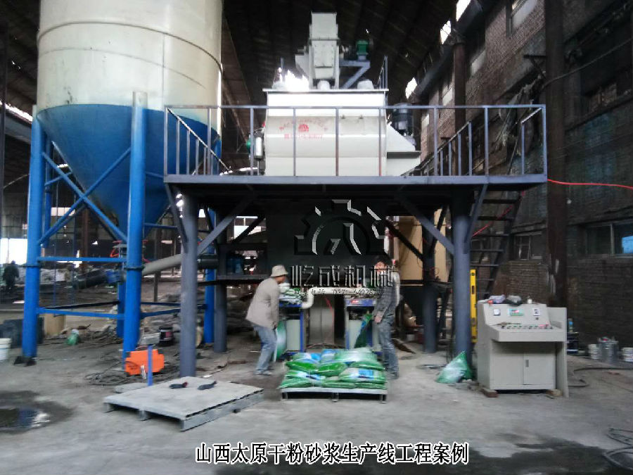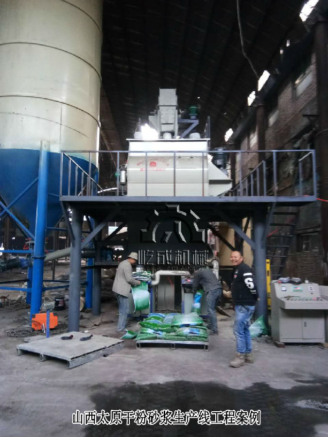 山西太原這套干混砂漿設(shè)備,類型為基礎(chǔ)型干混砂漿設(shè)備,主要組成包括儲(chǔ)料罐1臺(tái),螺旋輸送機(jī)一臺(tái),板鏈提升機(jī)一臺(tái),雙軸槳葉無重力混合機(jī)以及成品倉和包裝機(jī)。